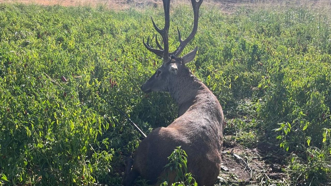 Çiftçi Mustafa Öztürk, kırsal Çubuk Mahallesi civarında biber tarlasındaki ürünlerini kontrol ederken, sulama hortumlarına dolanıp bitkin düşen, koruma altındaki erkek yaban geyiğini fark etti.