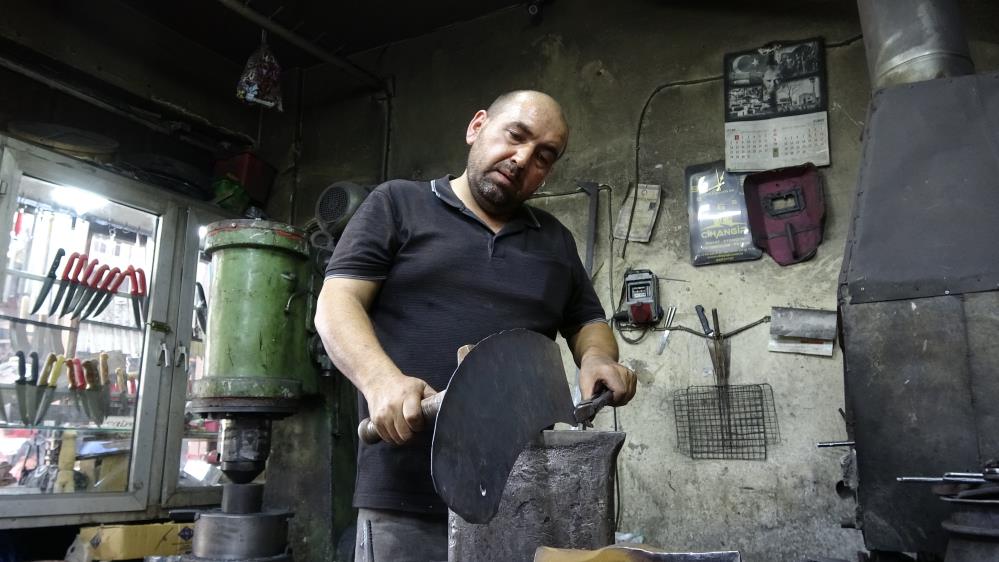 Demir parçalarını çekiçle döverek kazma, kürek, satır ve bıçak gibi aletlere dönüştürüyor